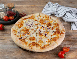 Тесто, Сыр моцарелла, Сливочный соус, Шампиньоны, Курица, Лук красный