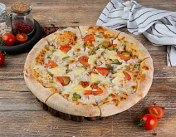 Тесто, Сыр моцарелла, Соус мутти, Помидоры, Сыр гауда, Огурцы маринованные, Курица, Майонез