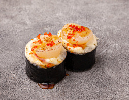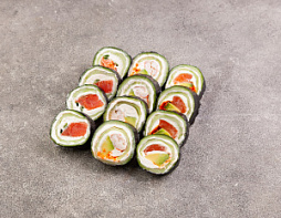Рис, Нори, Творожный сыр, Жаренный лосось, Огурец, Кунжут, Кимчи, Соус спайси, 8 шт