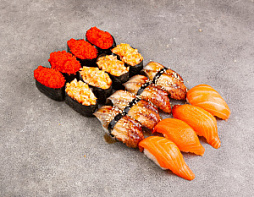 Суши с угрём, Суши с лососем, Гунканы с креветкой спайси, Гунканы с масагой, 16 шт