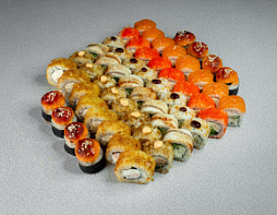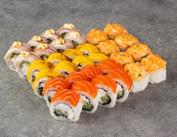Филадельфия лайт, Хот с креветкой, Запечённый с мидиями, Калифорния кани, Куриный в кунжуте с ким чи, Канада, Бонито, 56шт На этот товар скидки и акции не распространяютс...